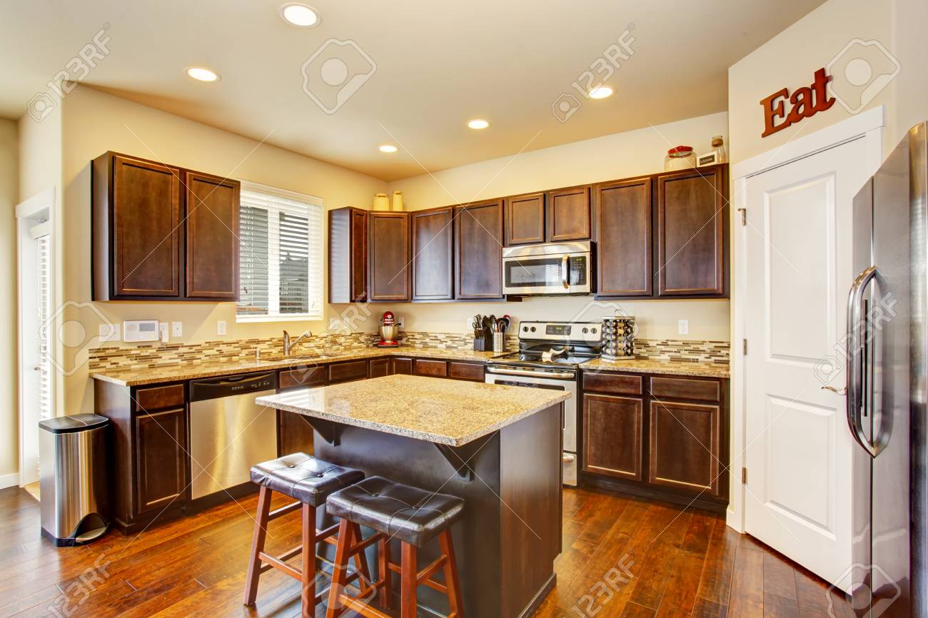 Habitacion Interior De La Cocina Con Gabinetes De Color Marron Oscuro Piso De Madera Y De La Isla Noroeste Ee Uu